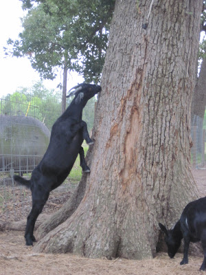 I am the best in the goat yard at this job. You can see because I am the tallest goat and can stretch waaayy up to get the high bark . Now, you all may think I am just a snacking goatie but it is more than that! You see,this is the tree the lightening struck and I have decided it needs to be removed and what better way to remove it than by eating it!